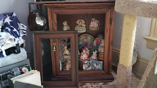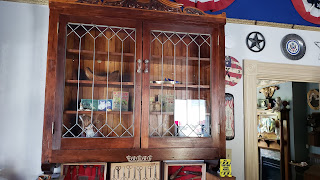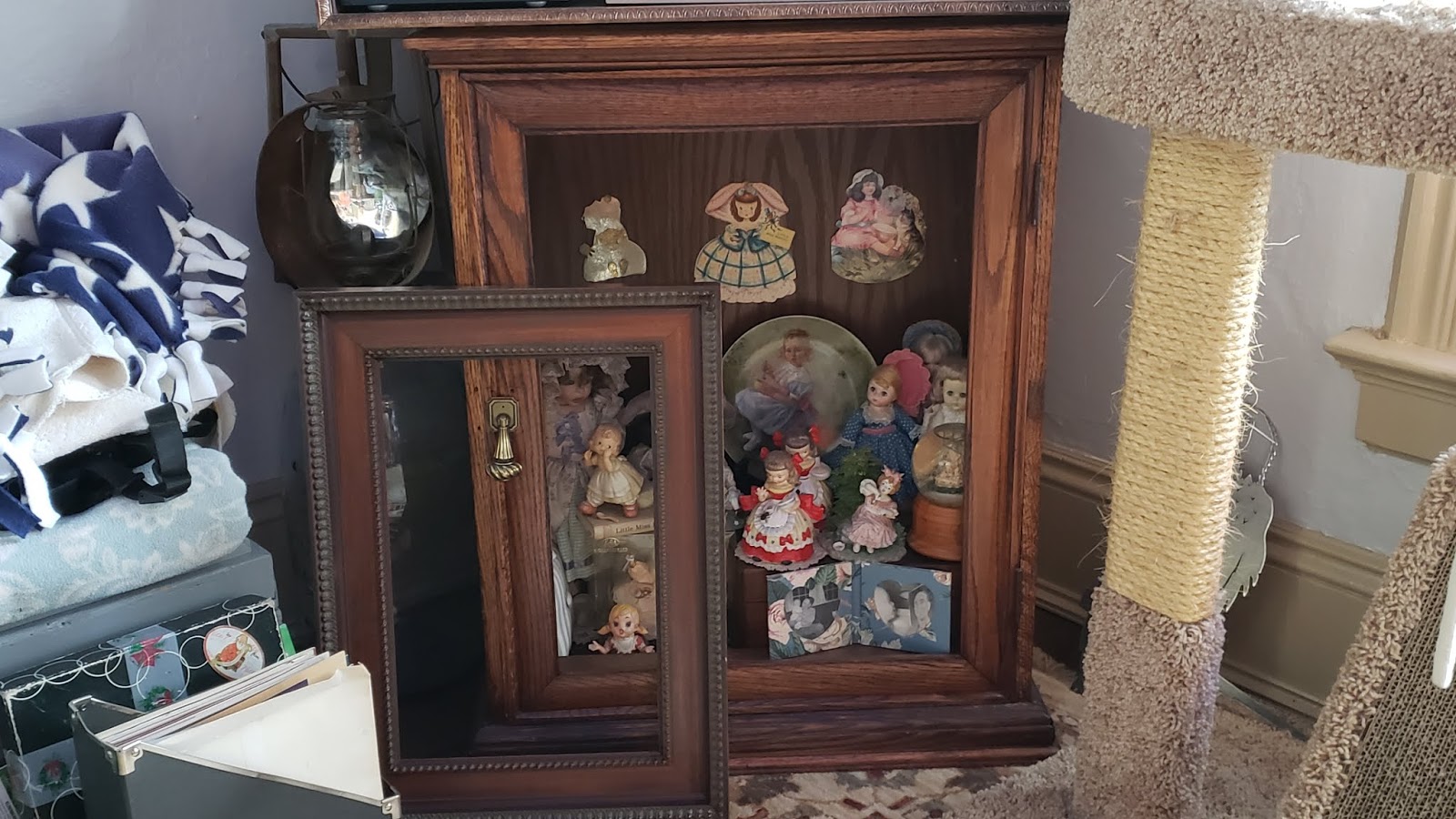 Picture frame is for a picture of Madison painted by a neighbor. Oak cabinet is a long stored project that we purchased many years ago. It has bright blue milk paint on the inside, covered blue with a tan paint stain & shellac.
